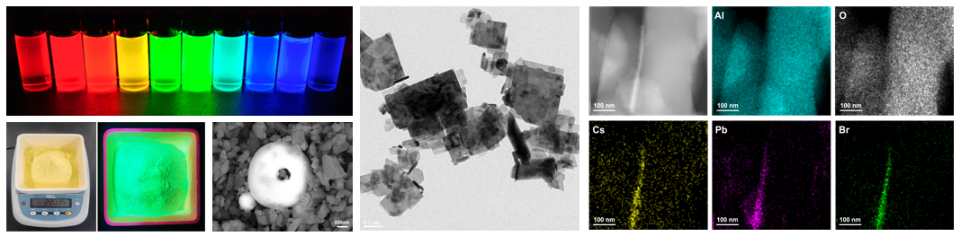저희 연구실에서는 양자점, 페로브스카이트, 광촉매 등과 같이 다양한 기능성 나노입자의 조성, 크기, 형태를 제어하여 합성하는 연구를 진행하고 있습니다. 특히, 나노입자와 세라믹 지지체 결합한 나노복합재료를 제작하기 위해 건식 및 습식법을 도입하여 세라믹 공정에 적합한 소재를 개발하고 있습니다. 이러한 내구성과 기능성이 향상된 복합재료를 통해 차세대 고감도 센서, 고효율 LED, 에너지 소자, 헬스케어와 같은 다양한 분야에 응용할 수 있는 기술을 연구하고 있습니다.