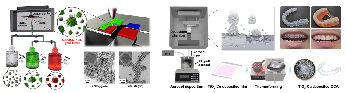 이를 광전자 소자, 조명, 센서, 헬스케어 등 다양한 응용 분야에 적용하여 혁신적인 솔루션을 제시하는 것을 목표로 하고 있습니다. 특히, 이러한 나노소재를 바탕으로 에어로졸 증착(Aerosol Deposition) 공정을 활용해 고성능 모듈 및 디바이스 개발을 중점적으로 연구하고 있습니다. 또한, 타 연구기관 및 산업체와의 융합 연구를 통해 폭넓고 실용적인 연구 성과를 도출하기 위해 노력하고 있습니다.