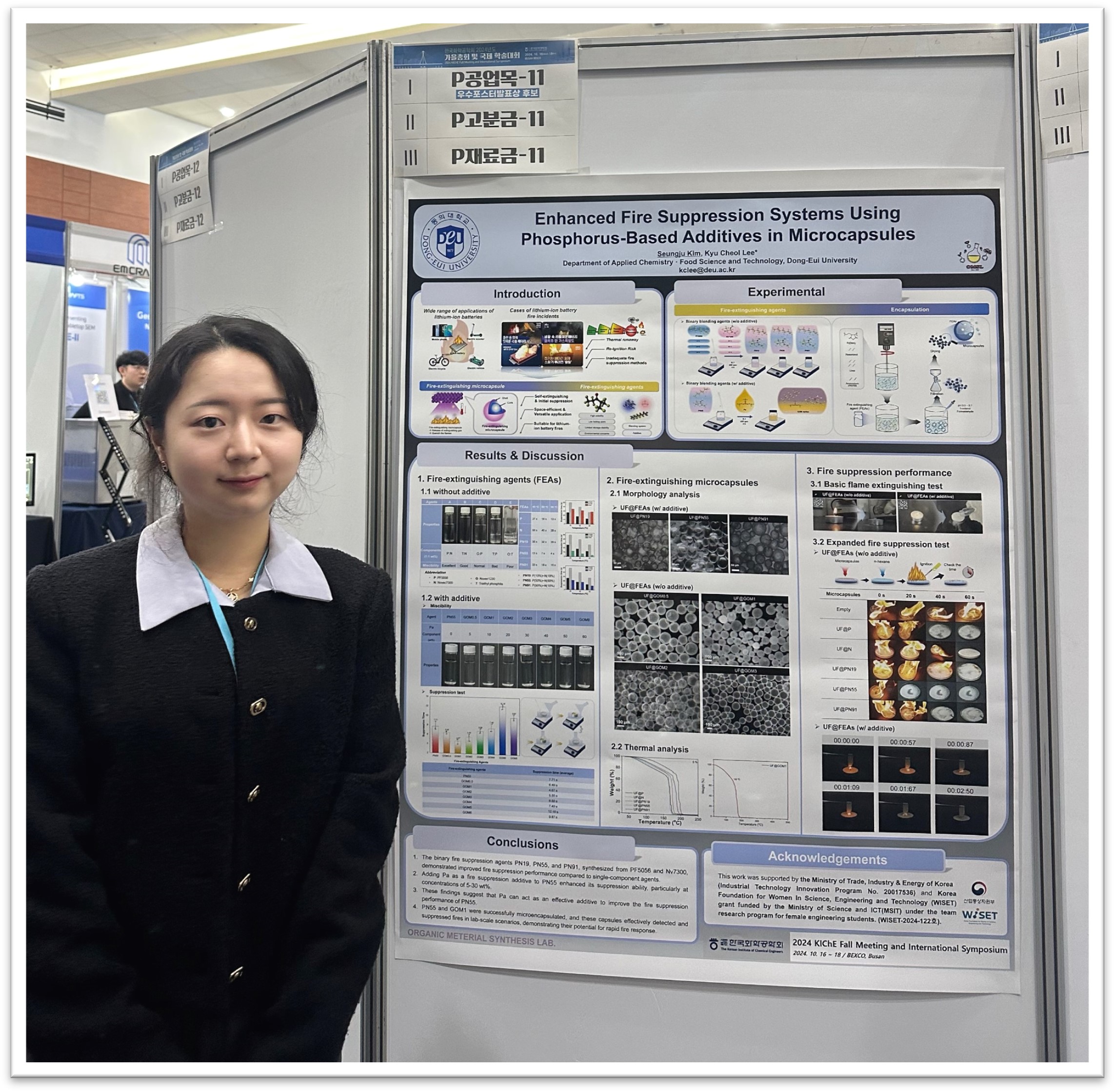 이날 김승주 석사과정생은 포스터발표 공업화학 부분에서 ‘Enhanced Fire Suppression Systems Using Phosphorus-Based Additives in Microcapsules’라는 주제로 공업화학 부문에서 단독 수상하는 영예를 안았다.