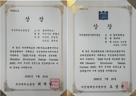 건축공학과 지상진, 성창준, 김민성, 홍세운(팀명: 지진나도 괜찮조 팀)과 엄용민, 김민철, 전영찬, 이주영(팀명: 엔티티 팀)이 지진방재연구센터 주관으로 부산대학교, 국토교통연구인프라운영원 주최, 행정안전부, 국토교통부를 비롯한 국내 전문 관련 기관으로 후원으로 개최된 2025 구조물 내진설계 경진대회에서 구조물 붕괴방지를 위한 내진설계를 주제로 참여하여 각각 부산대학교총장상과 지진방재연구센터장상을 수상하였다.