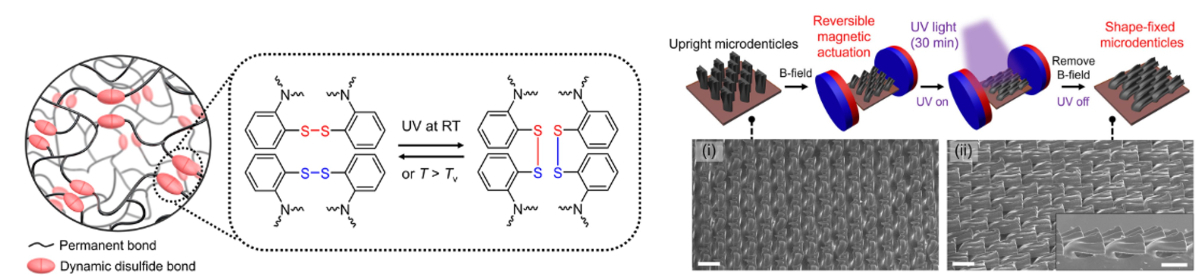 <동적 공유 결합 메커니즘 (왼쪽) 및 UV에 의한 미세구조 고정>