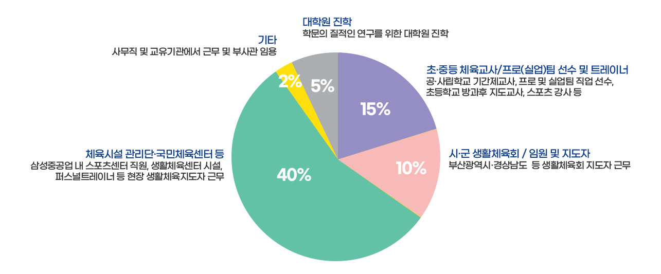 | 대·중견기업 스포츠센터 지도자 | 삼성, 현대, 롯데, 포스코, 한화 등(사내 종합스포츠센터), 기업 리조트(대명, 한화, 하이원 등), 워터파크 및 테마파크(김해롯데워터파크, 블루캐니언, 비발디파크, 설악워트피아 등), 프로구단 스포츠팀 채용(마케팅, 일반 업무직원) |