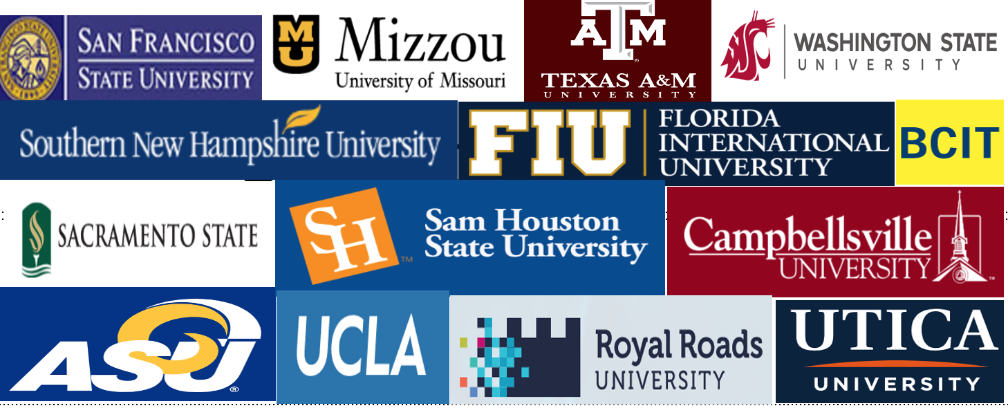 미국 (12개 대학): 샌프란시스코주립대학 (San Francisco State University), 텍사스 A&M 대학 (Texas A&M University), 미주리대학 (University of Missouri), 워싱턴주립대학 (Washington State University), 서든뉴햄프셔대학 (Southern New Hampshire University), 플로리다국제대학 (Florida International University), 새크라멘토주립대학 (California State University, Sacramento), 안젤로주립대학 (Angelo State University), 샘휴스턴주립대학 (Sam Houston State University), 캠프벨스빌대학 (Campbellsville University), 유티카대학 (Utica University), 로스엔젤러스 캘리포니아대학 핵융합연구소 (UCLA)