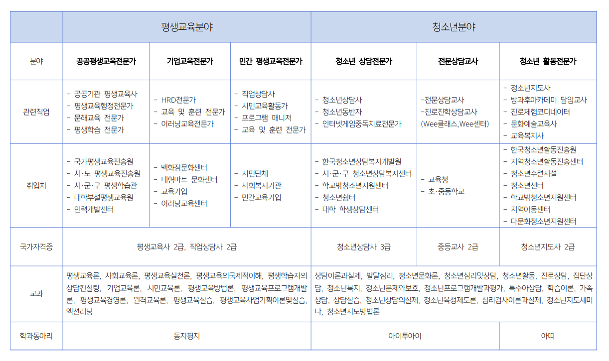 - 평생교육과 청소년상담에 대한 이론과 실제를 학습하고 경험함으로써, 평생학습사회의 변화하는 교육적 요구에 선도적으로 대응하며 국가 및 지역발전에 기여하는 평생교육사, 지역사회교육전문가, 교육심리 및 평가전문가, 기업교육 전문가를 양성하고, 또한 청소년의 심리와 발달에 대한 이해를 근거로 이들의 건강한 성장과 적응을 돕는 청소년 전문가 양성을 목표로 합니다.