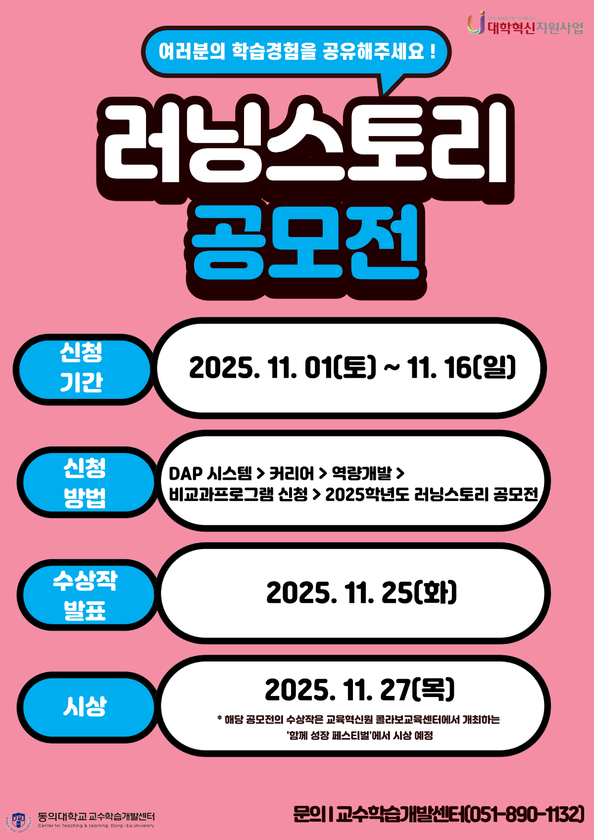 교수학습개발센터의 학습지원 프로그램인 2025학년도 러닝스토리 공모전을 안내하오니 많은 신청 바랍니다.