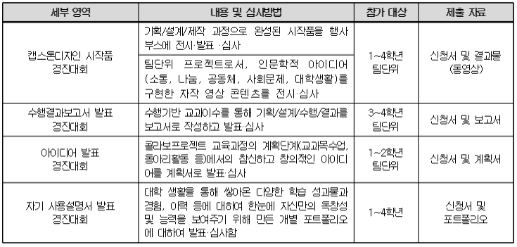교육혁신처에서는 대학혁신지원사업의 일환으로 통합 성과경진대회를 개최합니다. 많은 학생들이 참여하여 교과 및 비교과 학습 성과를 경합하고 공유할 수 있는 대회가 가능하도록 다음과 같이 협조하여 주시기 바랍니다.