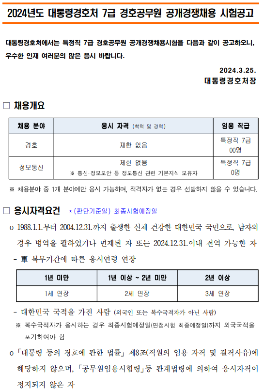 2024년 대통령경호처 7급 경호공무원 공개경쟁채용 공고