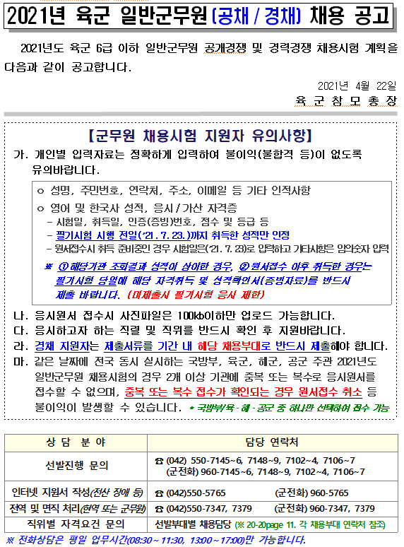 2021년 육군 일반군무원(공채 및 경채) 채용 모집 공고