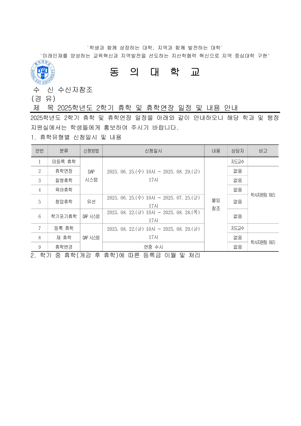 2025학년도 2학기 휴학 및 휴학연장 일정 및 내용 안내